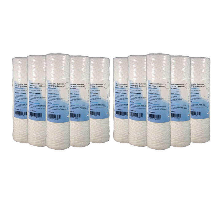 Supprimer les particules fines de votre eau telles que les boues, les colorations de l’eau et toute autres petites particules avec notre llot de 5 cartouches sédiments bobinées 9-3/4 10 microns en fil Polypropylène, noyau PP, pour corps de filtre standard 9″3/4 (248mm) ID21mm OD 28mm, Qualité Alimentaire certifiée ACS – Filtration 10µm. Prévue pour la filtration de particules fines.