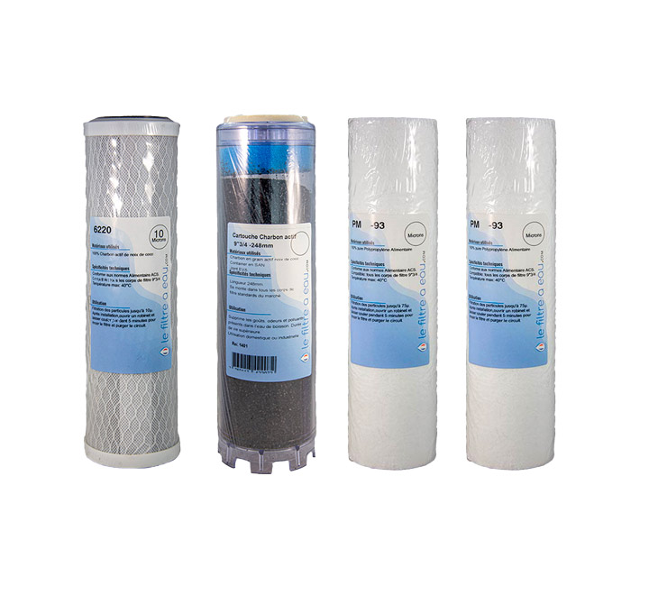 Toutes nos cartouches filtrante de rechange charbon actif ont une filtration de 5 microns et les cartouches extrudées on une filtration de 20 microns, mais aussi les cartouches ont une taille de 10 pour les TÉTHYS et 9 pouces ¾ – 248mm pour les cartouches standard.